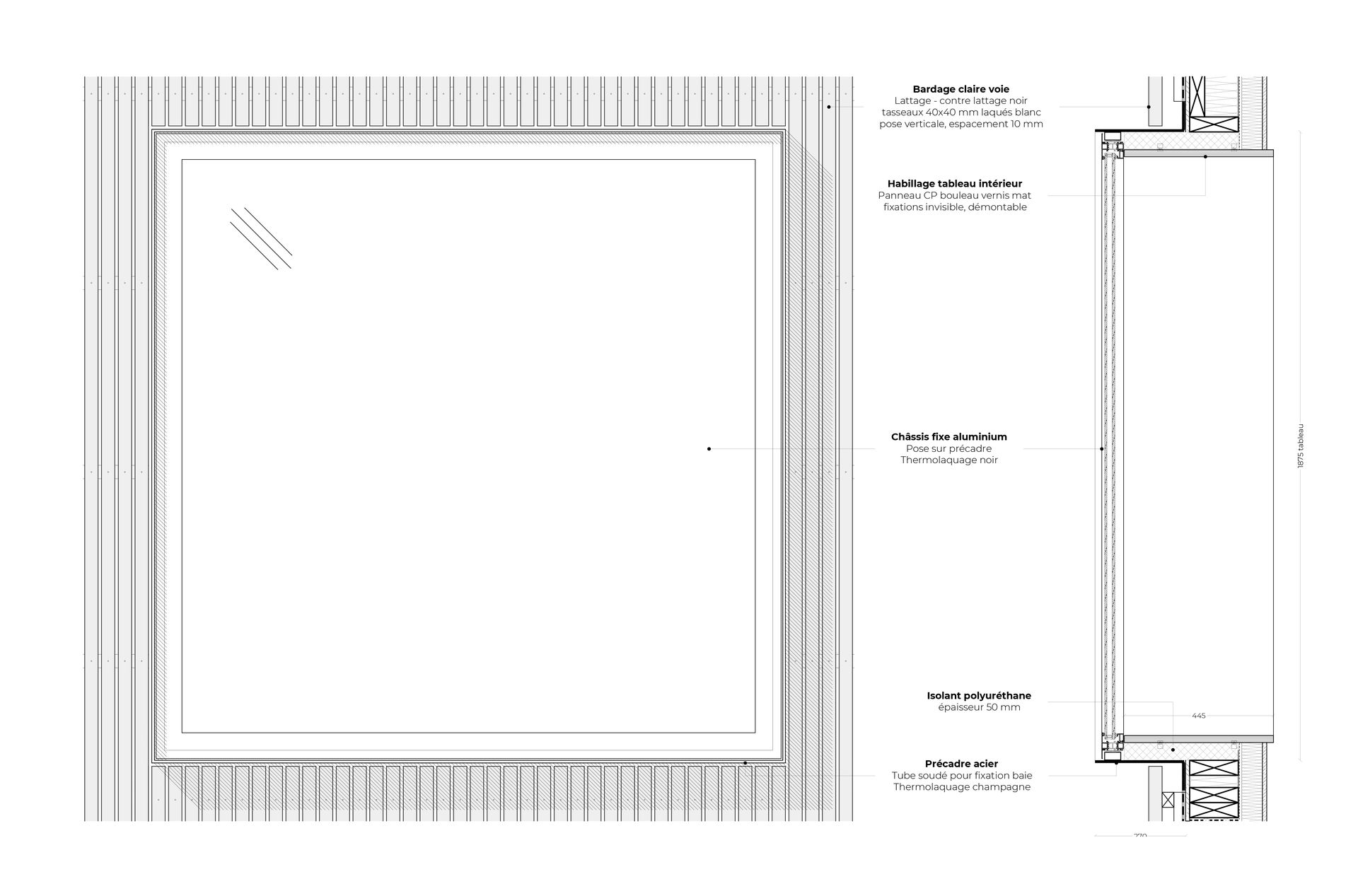On retrouve ce même bardage bois côté jardin et les détails en tôle laquée champagne.