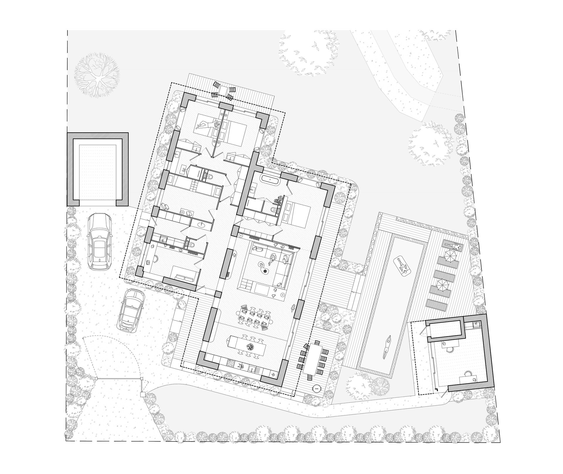 L’architecture articule deux volumes distincts : un espace jour lumineux, convivial et tourné vers les terrasses, et un espace nuit plus intime, préservé et apaisant. L’intérieur se prolonge harmonieusement à l’extérieur, autour d’un jardin paysagé pensé comme une continuité de la maison.