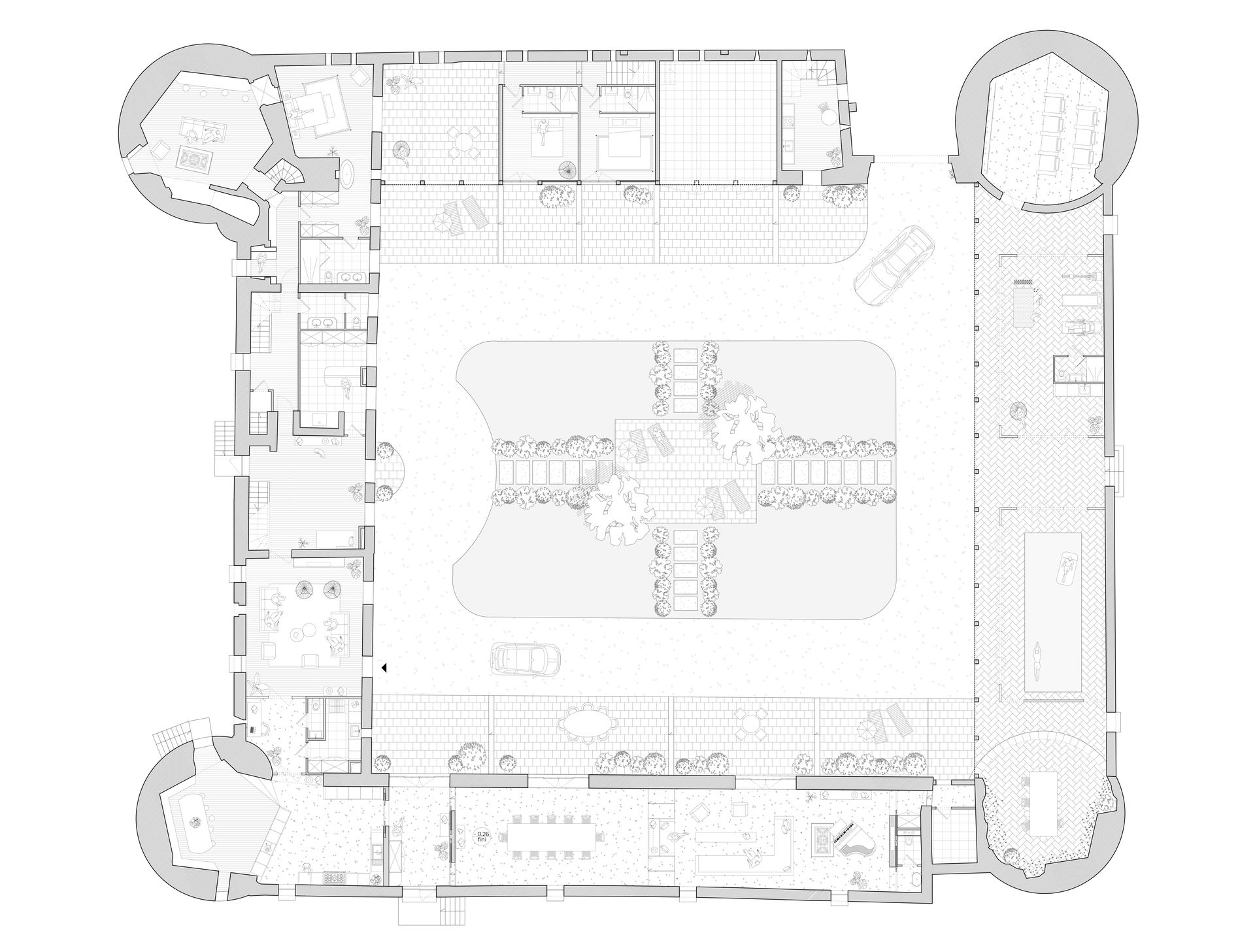 Nous avons ensuite décliné plusieurs esquisses de plans, en articulant les espaces entre les quatre ailes de la ferme.